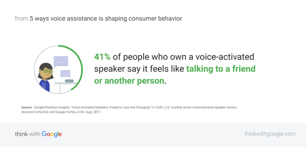 Google’ın verilerine göre akıllı hoparlöre sahip olanların %41’i onlarla kurduğu etkileşimin bir insan ile konuşmak gibi olduğunu söylüyor hatta lütfen ve teşekkür ederim gibi nezaket ifadeleri kullanıyorlar.