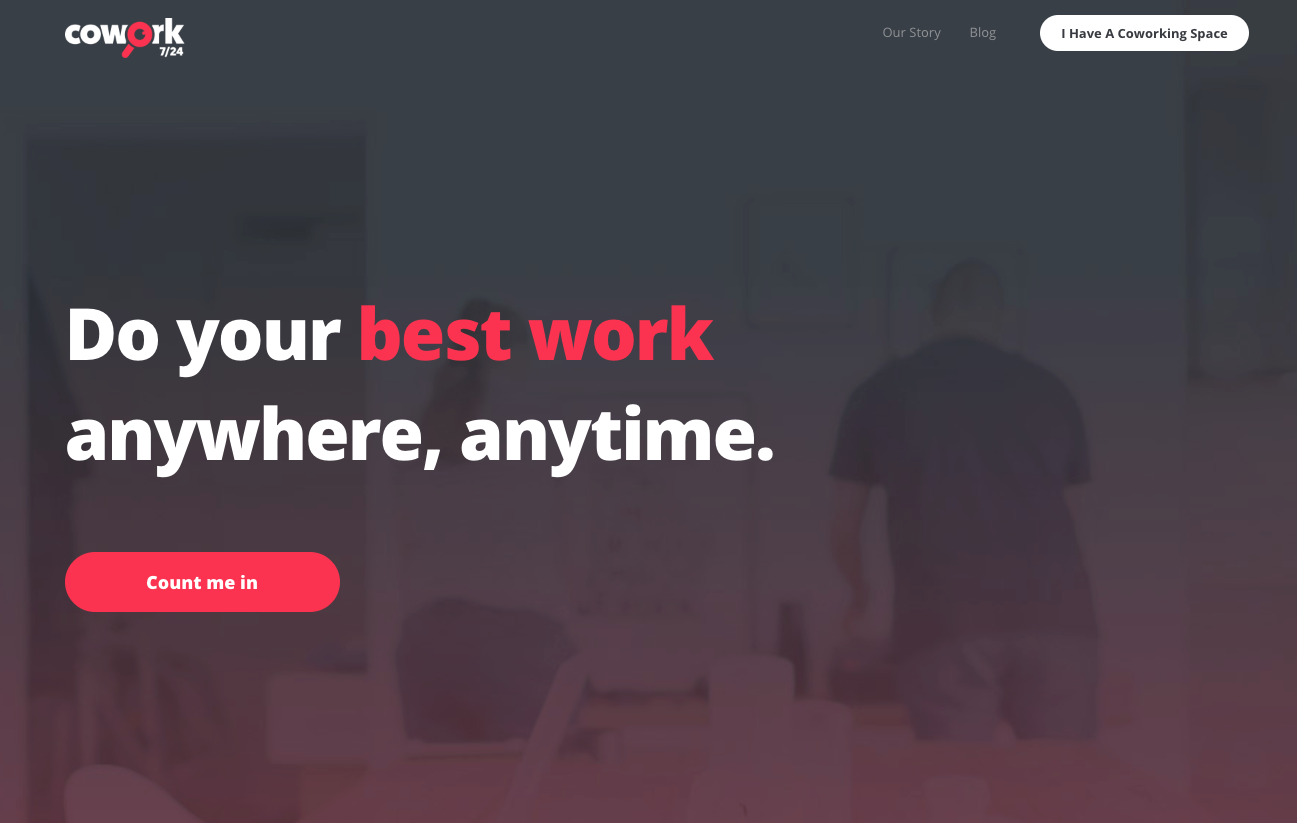 Cowork 7×24, tek bir uygulama üzerinden dünyanın 20’den fazla şehrindeki 130’dan fazla ortak çalışma alanına ulaşmanızı, rezervasyon yapmanızı ve diğer kullanıcılarla iletişimde kalmanızı sağlayan bir girişim. 2018 yılı itibariyle Asya pazarına da adım atan şirket, aynız zamanda bölgede faaliyet gösteren Türkiye’den ilk ve tek girişim.