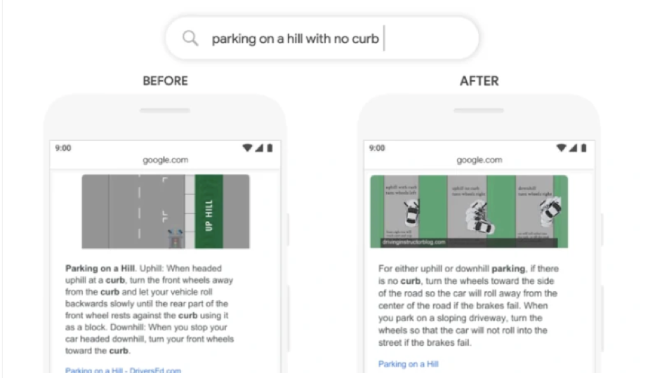 Örneğin, İngilizce dilinde “Kaldırımsız bir tepeye nasıl park edileceğini” aradığınızda Google şimdiye kadar odaklandıkları kısmı “parking on a hill” kısmı olarak belirtirken, artık “no curb” kısmını dikkate alacağını ve kaldırımsız park etme talimatlarını içeren en iyi sonuçları göstereceğini belirtiyor.