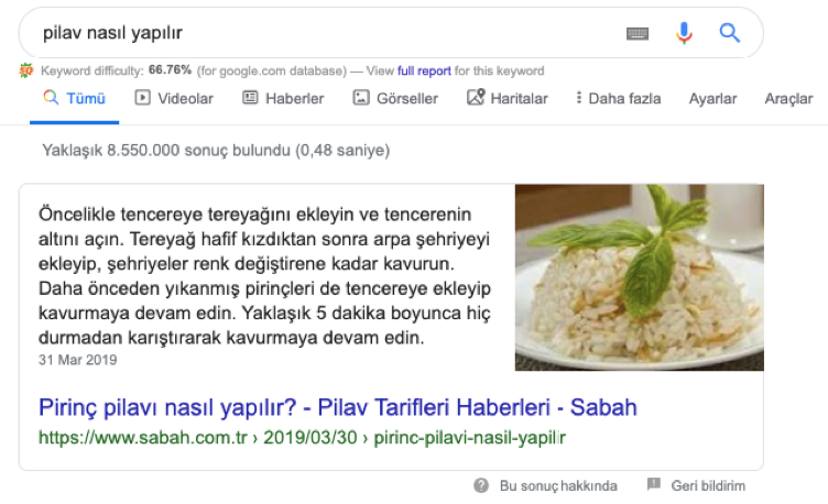 Kullanıcıların sorguları neticesinde karşılarına çıkardığı, arama gerçekleştiren kişinin yayıncı web sitesine bile tıklamasına gerek kalmadan “rank0” adını verdiğimiz kısımda ilgili sorgunun yanıtını, Google kendi verebiliyor. Aradığı sonuca doğrudan erişen kullanıcının, böylece karşısına çıkan bağlantıya tıklamasına bile gerek kalmıyor.