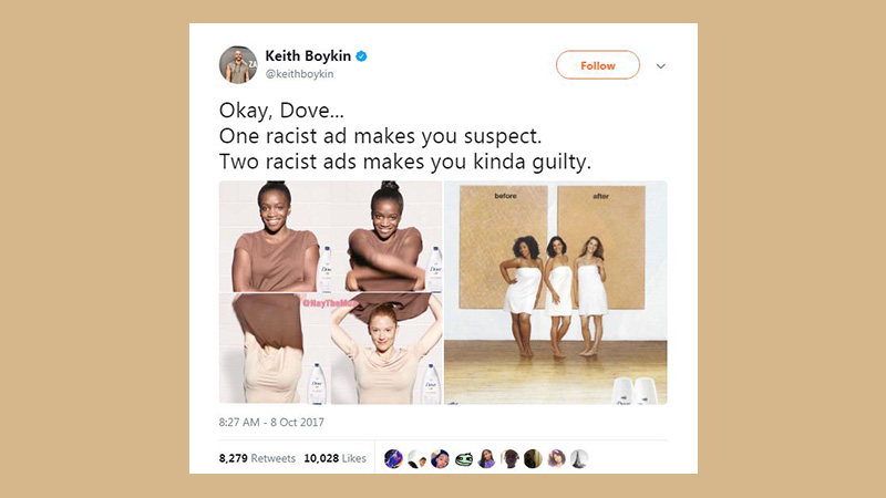 Dünyaca ünlü başka bir markayla devam edelim. Dove Unilever’in en büyük kozmetik ve temizlik markalarından. Son yıllarda “gerçek güzellik” gibi kampanyalarla kadınların gönlünde taht kurma girişimlerinde bulunsa da, aynı marka yakın zamanda temizlik ve güzellik mesajını kadınların renkleri üzerinden vermeye çalışma gafletine düştü ne yazık ki.