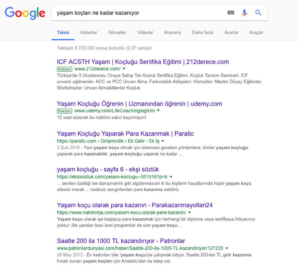 For example, if your online business idea involves becoming a business coach. Just type into the search bar, sentences people seeking business advice would use. Örnek olarak bir yaşam koçu olmak ve müşterilerinizi de internetten bulmak üzere bir iş fikri geliştirdiniz. Öncelikle bir arama yaparak başlayın;